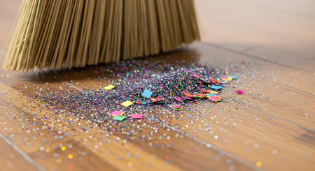 A close-up of a broom with brown bristles sweeping up a pile of colorful, messy glitter and confetti from a wooden hardwood floor. The image represents cleaning up after a party, a mess, or the tediousness of cleaning small particles.