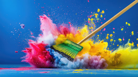 A striking image showcasing a dynamic explosion of vibrant color powder being swept up with a broom, set against a rich blue backdrop. The scene captures the essence of creativity and energy.
