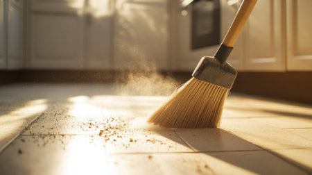 A broom is sweeping dust off a kitchen floor in sunlight, showcasing the essence of home cleanliness and the warmth of domestic life through detailed action and gentle light.