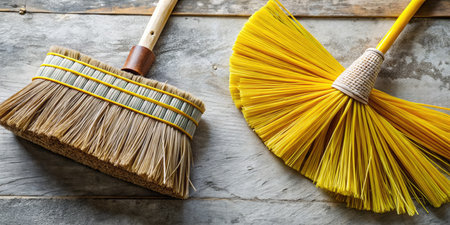 Two colorful cleaning brooms in blue and red are crossed against a bright yellow background, symbolizing cleanliness and domestic upkeep.