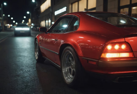 A vibrant red sports car is captured under colorful neon lights in a lively urban nighttime setting