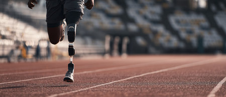 Man with prosthetic leg running on stadium track. Healthcare and medical concept.