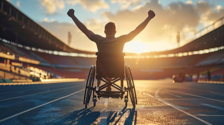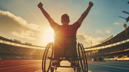 Wheelchair athlete celebrates victory in a stadium. Exuberance radiates from the sportswoman as she triumphs in an arena, arms raised in success..
