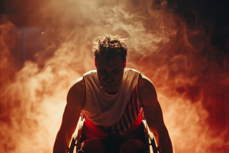 Dynamic illustration of a basketball player in a wheelchair performing a powerful jump shot amid an intense golden-hued abstract background.