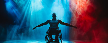 A powerful wheelchair dancer captivates under stage lights in a modern dance performance.