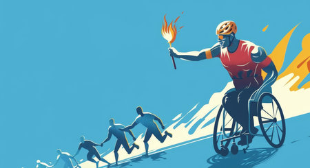 A joyous wheelchair racer crosses the finish line, celebrating a hard-earned victory. The crowd cheers wildly.
