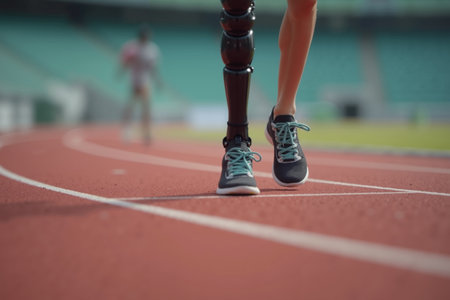 prosthetic leg running on a red track in the background.