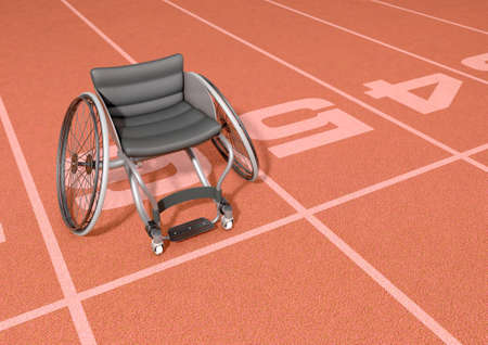 An empty modified wheelchair used by handicapped athletes to compete in various sporting codes on an orange marked athletics track background - 3D render