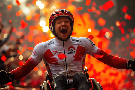 A joyous wheelchair racer crosses the finish line, celebrating a hard-earned victory. The crowd cheers wildly.