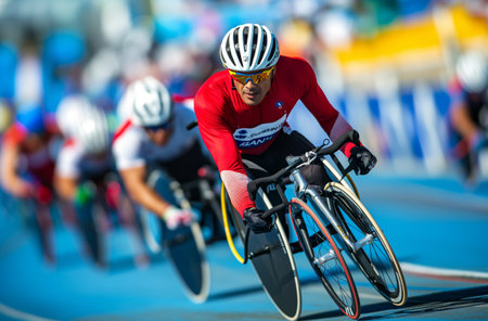 A thrilling race captures the spirit of competitive sports as men in wheelchairs speed down a track, Wheelchair athletes competing in a marathon, AI Generated