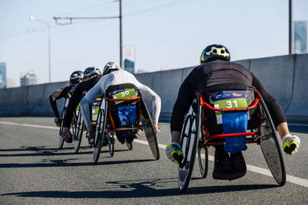 Kazan, Russia - May 17, 2022: group disabled athlete in wheelchair during Kazan Marathon