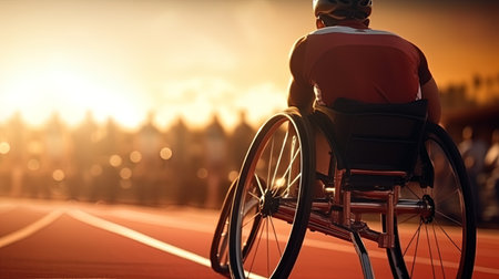A man in a wheelchair participates in a training session on a track, showcasing strength and determination, An image capturing the determination of a wheelchair athlete, AI Generated