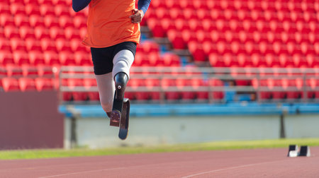 Man with prosthetic leg running on stadium track. Healthcare and medical concept.