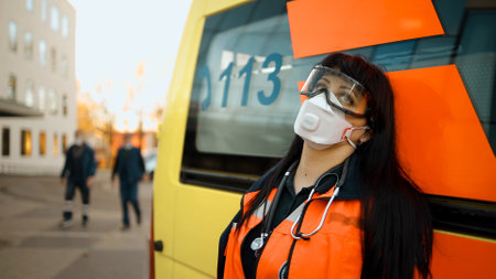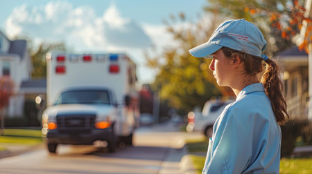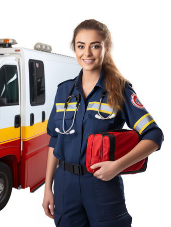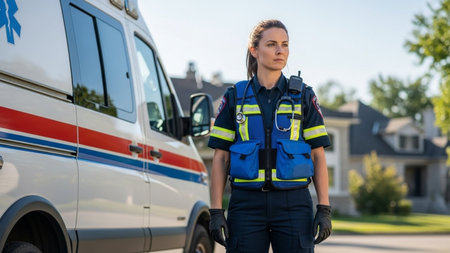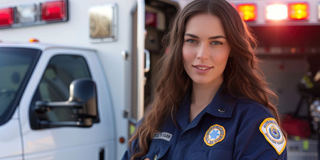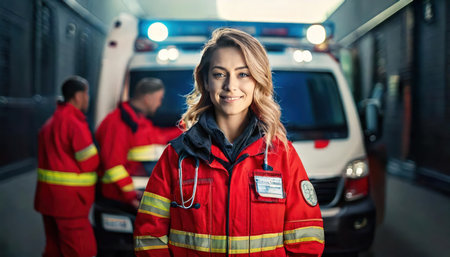 Female Paramedic Standing Confidently in Front of Ambulance Vehicle. High quality photo