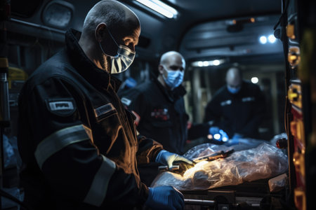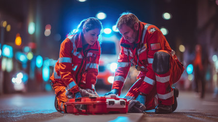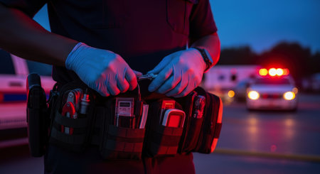 Paramedic gloved hands organizing medical equipment on a utility belt. blurred ambulance lights and vehicle bokeh in the background at night, symbolizing emergency response and healthcare.