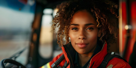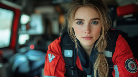 Young female emergency responder in uniform posing confidently inside a rescue vehicle during a sunny afternoon. Generative AI