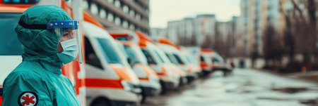 Medical personnel in masks and face shields monitor lines of ambulances at a crowded hospital engaged in disease combat operations.