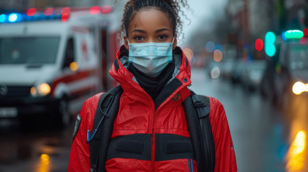 Captivating image of a dedicated African American female paramedic in a red jacket and surgical mask, posing in front of an ambulance with lights on, highlighting her crucial role in medical emergencies.