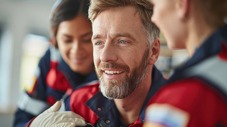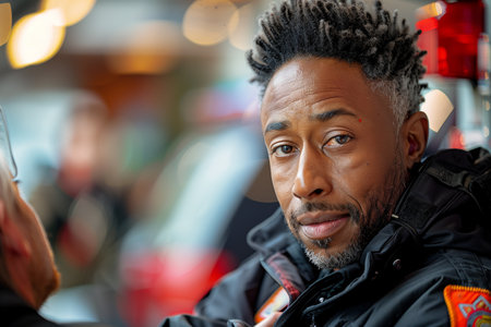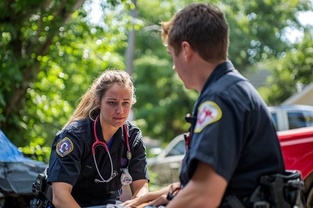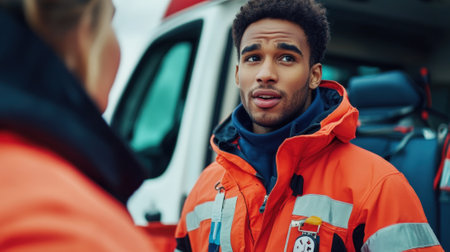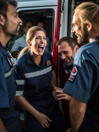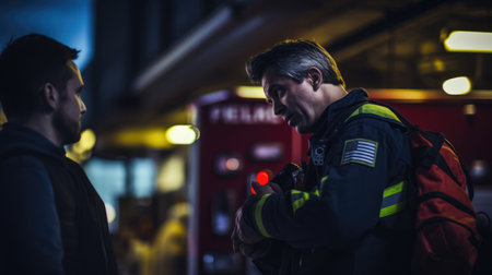 Firefighter and paramedic exchange a knowing look both expressing gratitude for successful collaboration