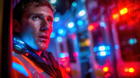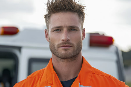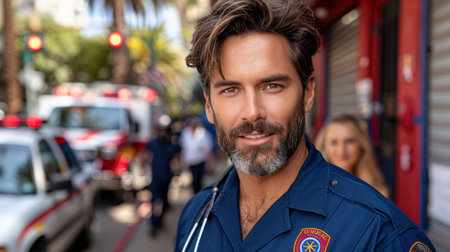 Confident male paramedic in uniform smiles warmly, with emergency vehicle lights softly glowing in the background, showcasing dedication to service.