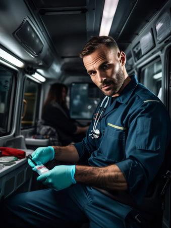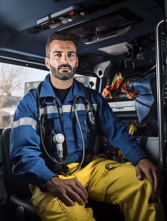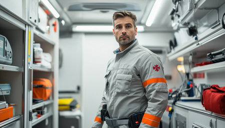 Confident paramedic standing inside ambulance, surrounded by medical equipment, ready to respond to emergencies