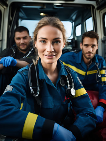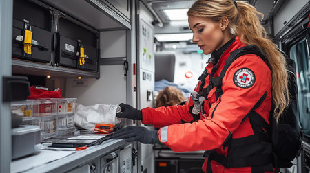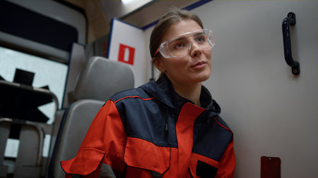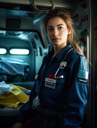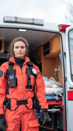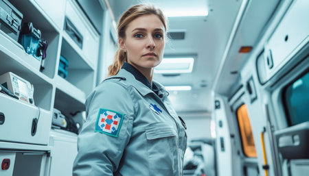 Confident female paramedic standing in a fully equipped ambulance, ready to provide emergency medical assistance
