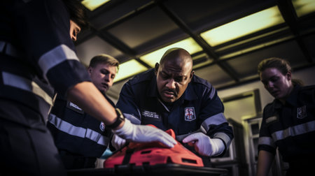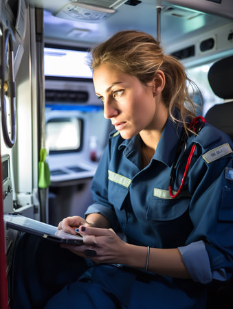 A dedicated first responder focuses intently while holding essential medical records, poised to provide urgent care in a fast-paced emergency situation. The atmosphere is tense and professional.