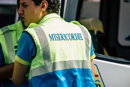 Rome Italy September 29, 2019 View of ambulancier assisting tourists in distress front the Coliseum of Rome in the morning