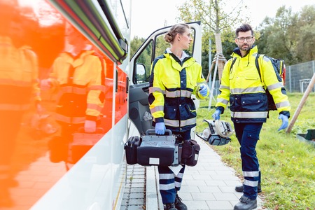 Smiling professional paramedic discussing work with colleague in emergency car. Female medical assistant waving head no. Emergency medical doctor rushing to rescue in ambulance van. Medical concept