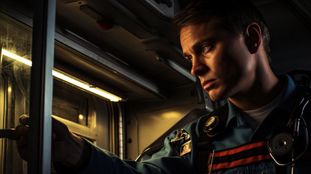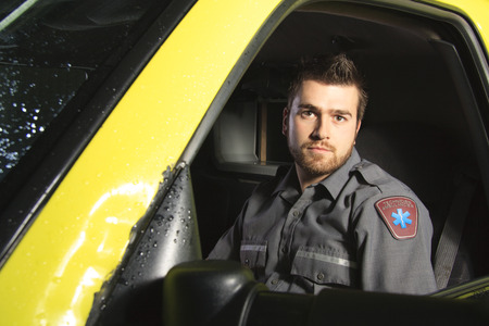 Portrait of a male pilot in an ambulance car. Selective focus.