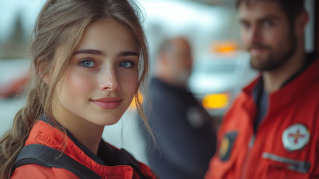 Young woman in rescue uniform stands confidently at the emergency response center with team members behind her in daylight. Generative AI