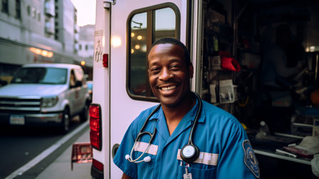 Cute Afro-American man in paramedic suit on ambulance. High quality photo