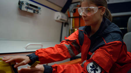 Focused paramedic ambulance in uniform driving in emergency vehicle. Emergency care assistant preparing medical equipment for fist aid at car accident. Female doctor getting ready stretchers to use
