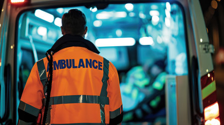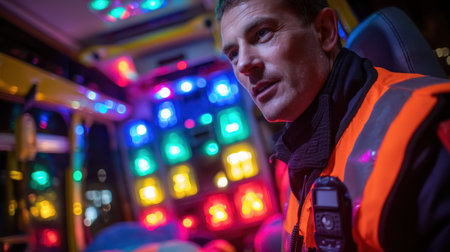 Paramedic providing emergency aid in ambulance with flashing lights.