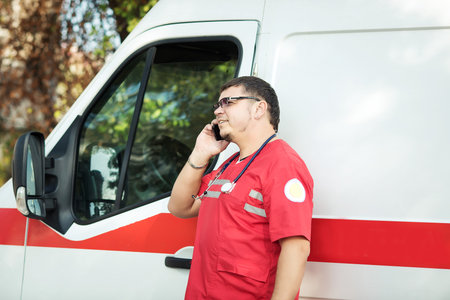 A man wearing a navy blue uniform stands in front of a white and red ambulance with flashing lights. The man appears to be a paramedic or emergency medical technician.