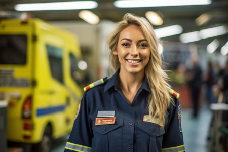 Portrait of a smiling female paramedic blurred background ambulance. Generated by AI