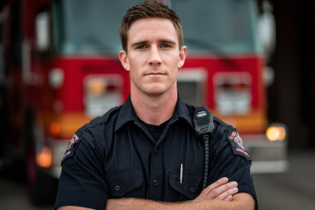 A young firefighter with short hair and brown eyes stands tall with arms crossed. The background features a fire truck, emphasizing his commitment and strength in this professional setting.