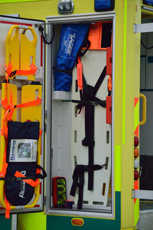 Detail of the interior of an ambulance, equipped with oxygen breathing system and other medical materials.