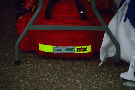 First aid kit an open red first aid kit bag with a black zip and handle, in closeup. and handle in an open fire truck