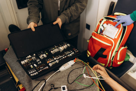 Emergency medical technicians prepare advanced medical equipment for a nighttime response in a busy urban area, ensuring readiness for patient care
