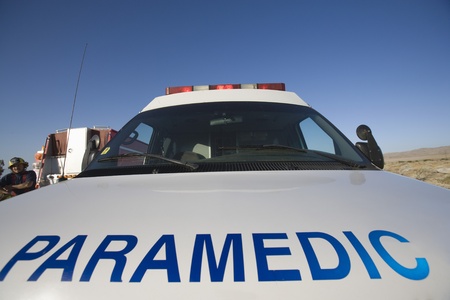 Paramedic employee with ambulance in the background.