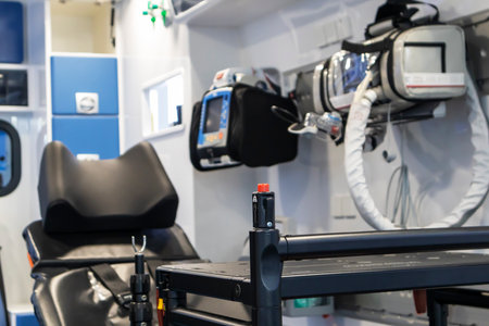 Inside an ambulance car with medical equipment. Medicine and healthcare