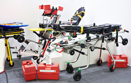 Emergency medical devices, ambulance interior details with necessary patient care equipment. Basic emergency for quick health help service.