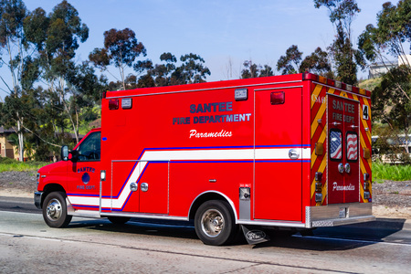March 19, 2019 Santee / CA / USA - Fire Deparment Paramedics Vehicle driving on a street