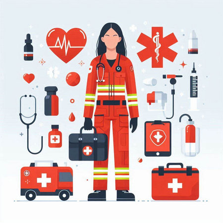 Flat vector illustration of a doctor in a red uniform and medical equipment.