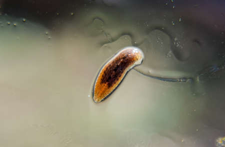 Turbellaria Flatworms Planaria by microscope. Freshwater microscopic wild nature and aquarium inhabitant. Super Macro