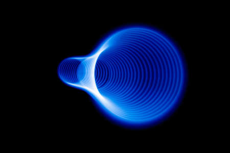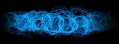 Blue, red, white and purple light painting photography, long exposure, ripples and waves against a black background. Curves and waves of neon green light against a black background.