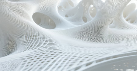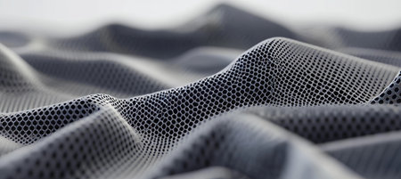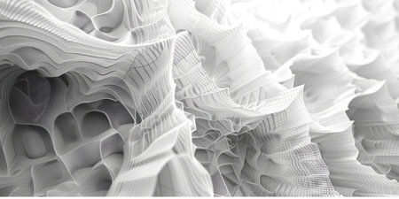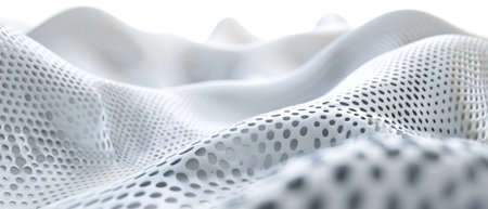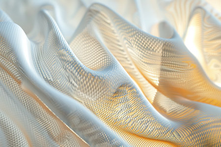Close-up showcases softly folded white mesh material, creating a delicate textured surface. The wavy patterns and subtle lighting enhance the visual appeal, emphasizing the material's unique form.