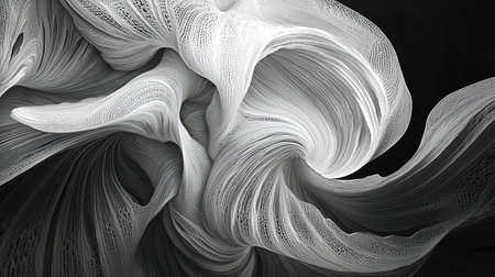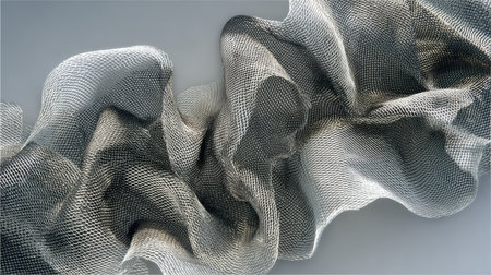 This abstract image features a wavy texture of metallic mesh, creating a flowy design in monochrome shades. The piece is ideal for artistic projects and modern designs.