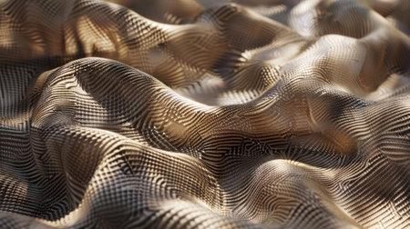 Striking abstract waves of metallic textile create a mesmerizing play of light and shadow. This intricate pattern captivates with its fluid dynamics and elegant textures. Generated A.I.
